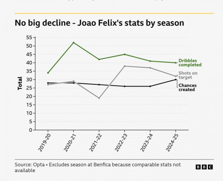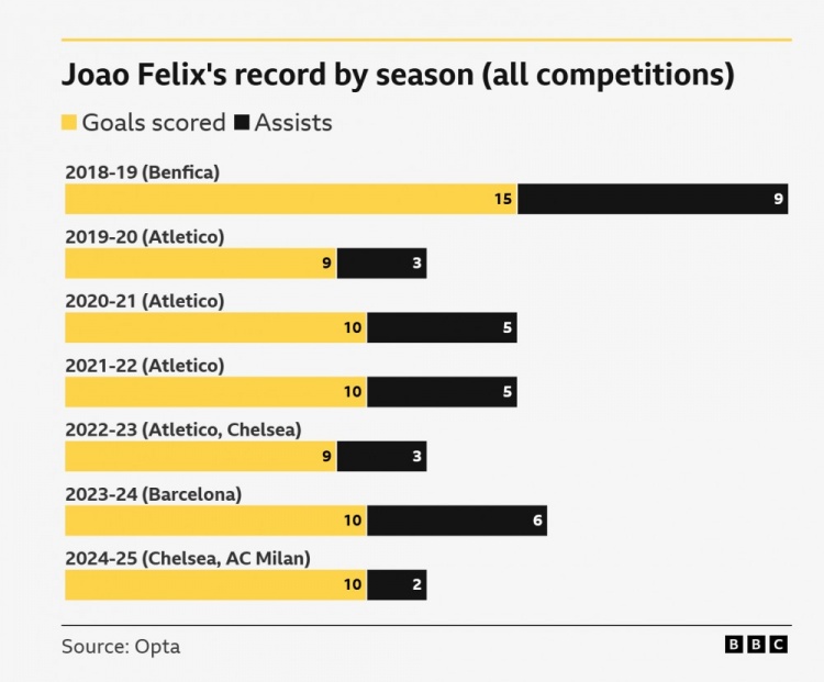接下来的赛季,球队整体表现下滑,但他个人斩获队内最佳球员(贡献10粒进球后因伤提前报销)。BBC当时一篇报道开篇写道:“在经历了两年半令人失望的表现后,菲利克斯终于展现出跻身世界顶尖球员行列的潜质。”